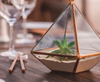 Geometric designs, embodying harmony and balance, cater to modern couples. Triangles signify strength, circles denote unity, and squares symbolise stability, aligning with the theme. Fill them with plants, succulents, or fairy lights for an elegant and eco-friendly touch. Customise each centrepiece to reflect meaningful locations, such as using sand for a beach proposal, plants representing your first home's garden, or crafting a mini forest-scape for cherished camping memories.